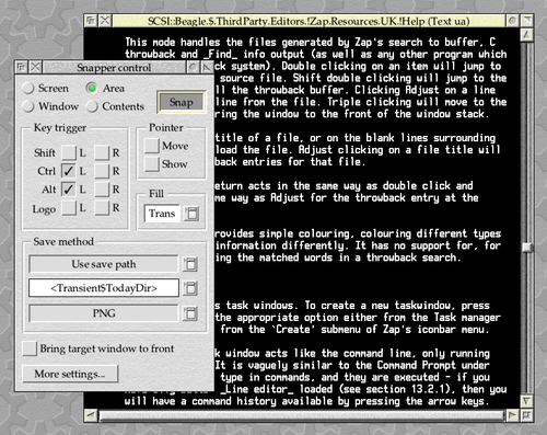 All windows are views on to areas of the screen, which usually belong to an individual applications. Some, like the one belonging to Snapper to the front and left of the screenshot above, have a small fixed area which is always in view; others, like the Zap window to the back right, have a much larger area than is visible at any one time and which can be explored using their scroll bars. The area that’s visible is known as the visible area, while the whole ‘virtual’ area encompassed by moving the scroll bars from one extreme to the other is the work area. The job of the Wimp is to look after these areas and help the application to update them when required.