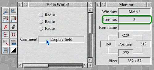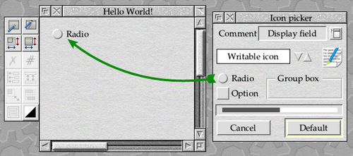 We now need to add the display field below the radio icons. Again, the Icon picker comes to our aid: select the Display field at the top by clicking with Select, then add in the Comment to its left by clicking with Adjust. Drag the resulting pair of icons across into our window, and drop it roughly centrally below the radio icons, something like Figure 19.10. If you need to move them, select them both and drag them around together. Hovering over the icons should show that the Display field is icon number 3 while the Comment is icon number 4, as seen in the screenshot.