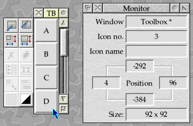 Since the toolbox can’t be resized by the user, we can be fairly confident that its width and height will still be as they were saved in the templates file. These can be used to give us the values for the toolbox pane’s width and height, saving us from having to use constants in the code. Before making any changes to the toolbox’s window state block’s contents, we therefore calculate the width and height of the pane’s visible area and store the two values for future use.