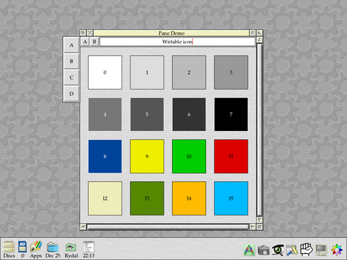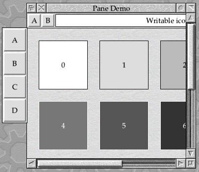 Running the updated application should reveal a new toolbar attached to the top of the main window, as shown in Figure 3.5. If resized or moved around the screen, both the toolbar and the original toolbox should move and adjust their sizes together. Note that if the caret is placed in the toolbar’s writeable icon, the main window is shown as having input focus: this is a result of the panes having their ‘window is a pane’ flags set.