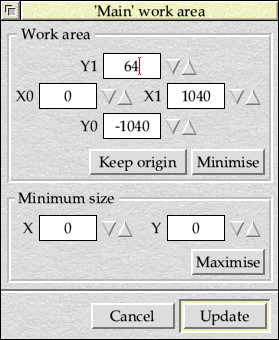 This shouldn’t be too surprising, as the toolbar pane is overlaying part of the main window’s work area and the Wimp knows nothing about it. It’s up to us to us to make an allowance for the effect, and the easiest way is simply to extend the work area by the height of the toolbar pane. One solution can be seen in Figure 3.6; the new Y1 extent of 64 OS Units allows for both the pane’s work area height of 60 OS Units and the lower window border of 4 OS Units.