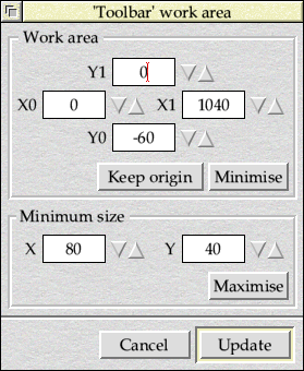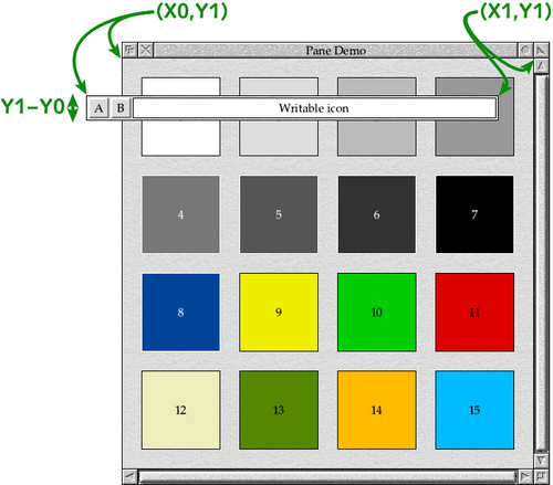 The tops of the two windows (Y1 for the two visible areas) are once again level, whilst the bottom of the pane (its Y0) is the height of the pane below the top (Y1) of the main window. This means that the vertical dimensions for the toolbar’s visible area are calculated in exactly the same way as for the toolbox.