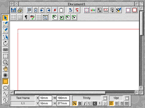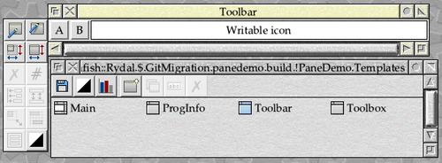 Much of the window design, including the window flags, is the same as for the toolbox. The toolbar has no window furniture, has its ‘window is a pane’ flag set and its ‘window is moveable’ flag clear.