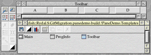 Following the now familiar pattern, we’ll begin by updating the window templates for our new example. As our code was starting to get a little unwieldy, we will begin by losing the toolbox to the left of the window, leaving just the toolbar at the top. The “Toolbox” template can therefore be deleted from the template file, leaving just the three templates for the main window, toolbar and program information window as seen in Figure 4.2.