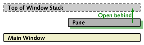 In order to get the position in the stack correct, we can open the pane behind the same window that the main window has just been opened behind, which will have the effect of placing it in the required location directly in front of the main window.