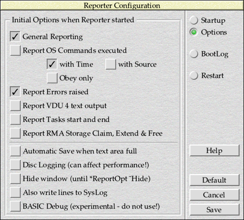 Whilst such a level of detail can be useful when tracking down problems, it can also very easily swamp us with data in normal use – as soon as you start to interact with the desktop, you’ll quickly see more lines appear. For this reason, I would suggest opening Reporter’s Configuration dialogue (click Menu over its window and choose Config...) and adjusting its settings a bit. Go to the Options tab and make sure that Report OS Commands executed; is unticked as shown in Figure 9.3. You can then save the settings, and restart Reporter to make them take effect – you can do this automatically through the Restart tab before clicking on Save.
