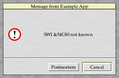 This isn’t quite the whole story, however, because there’s a potential problem. If we quit Reporter and try the same thing again, what we get is an error report (which, thanks to the last chapter, we can at least now identify as being a program report) telling us that “Example App may have gone wrong” and offering us the chance to Continue, Quit or Describe. The first two options will both cause the application to exit, while Describe takes us on to another report which contains the message “SWI &54C80 not known”.