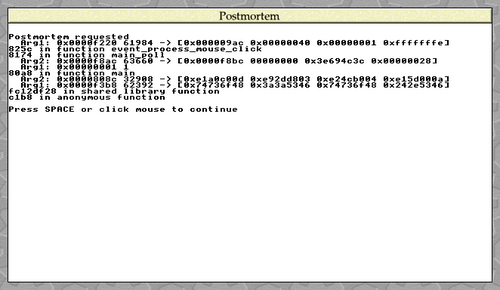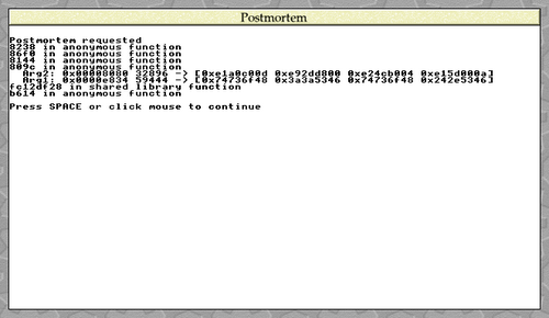 At this stage, it’s often possible to request a postmortem by clicking on ‘Postmortem’. This will be presented in a single-tasking text window on the desktop, ending with the familiar “Press SPACE or click mouse to continue” message. The postmortem should show us where in the program the error occurred, but – as shown in Figure 9.8 – all it tells us is “anonymous function”.