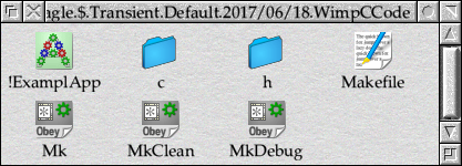 Creating an application directory is surprisingly easy. First, clean the project by double-clicking on the MkClean TaskObey file. Next, click Menu over the folder, slide over New directory, enter the name “!ExamplApp” and press Return. This will create a new directory but, because the first character of the name is an exclamation mark, it automatically becomes an application directory. The project folder at this stage should look similar to that shown in Figure 17.1. Note that the name has been chosen to keep it within a ten character limit which still exists in some parts of the system.