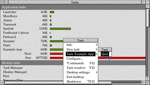 Ending a Wimp application is the reverse of starting one up: it must free any resources it has claimed, and de-register itself from the Wimp. The latter is done with the Wimp_CloseDown SWI.